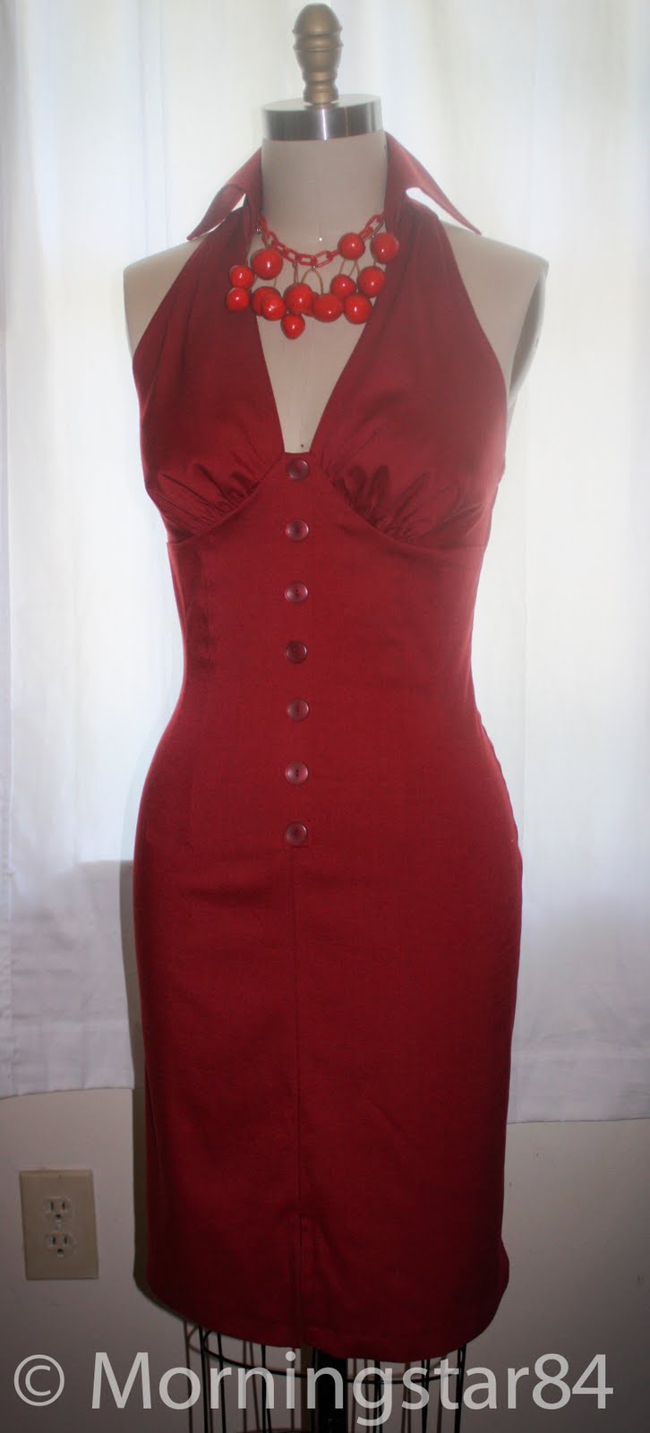 This dress is made from a stretch cotton blend, i draped the halter & collar and made a pattern. This was a sample to try out the pattern, and is available at sample discount price at my Etsy Shop. The front does not button, since with a fitted dress buttons gap and come undone. Zipper up the back with elastic across the top.