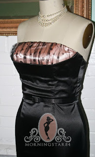 Such a classic little black dress, strapless with tulle shelf bust detail, matching fabric belt. Made using a black stretch satin, nude bust lining with dotted tulle overlay.